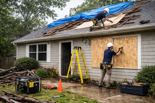 We begin with a comprehensive inspection to assess visible and hidden damage. High winds often loosen roofing materials, damage flashing, tear off siding, and compromise gutters and windows. Once identified, we provide temporary protective measures such as emergency tarping and board-up services to prevent further water intrusion.